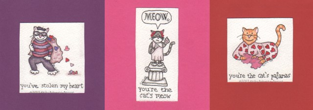 Well, I was also working on these Valentines, to help everyone celebrate the traditional day of love & lovers. Available for purchase, right now, chez my Etsy shop. (I worked in some French, there, to make it more continental, and romantic. Did you notice?) Your sweetheart would love a hand-painted, hand-crafted Valentine. I just know it.
