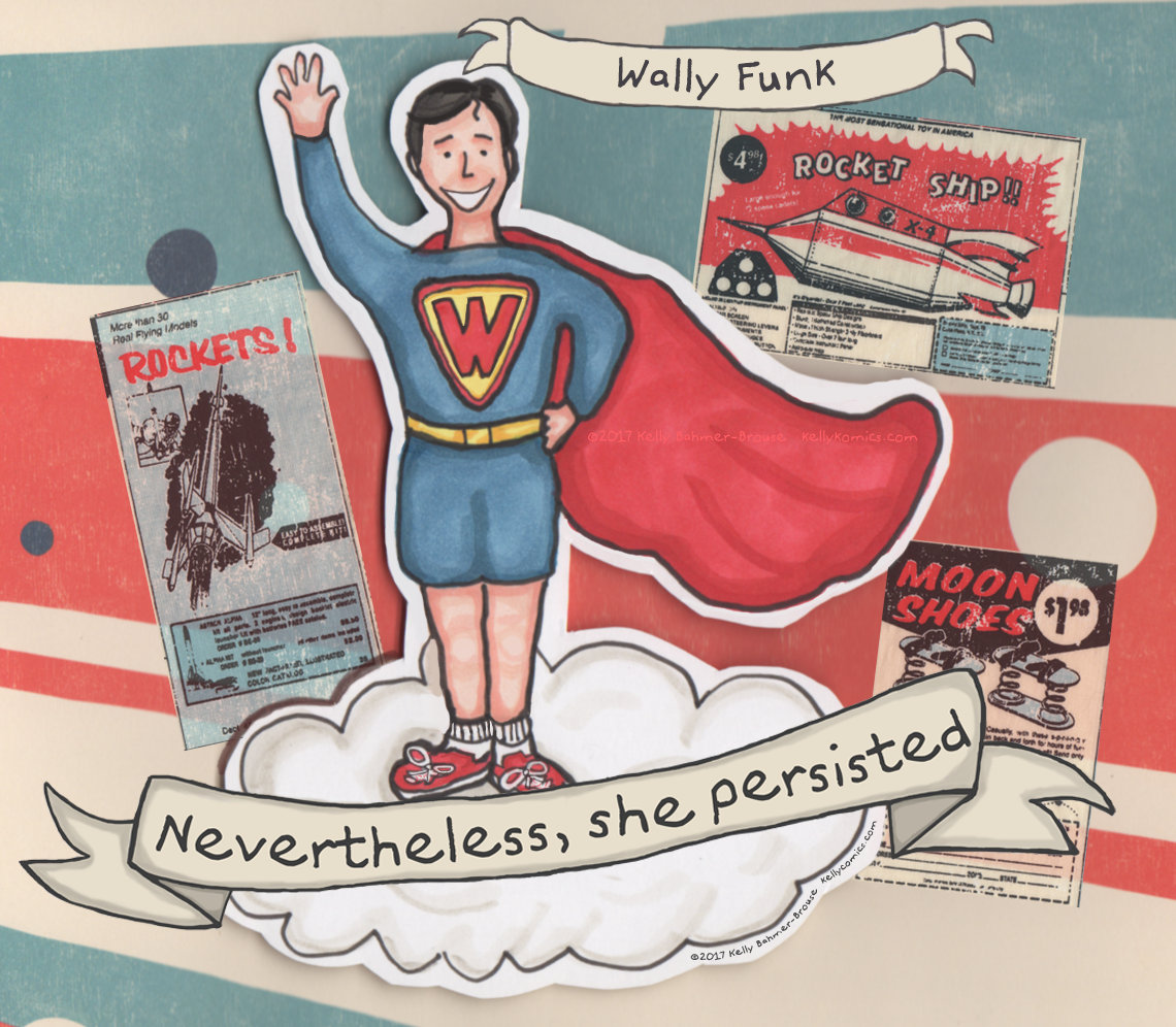 Background images in my drawing of Wally Funk come from October Afternoon’s “Rocket Age” series of scrapbook papers.