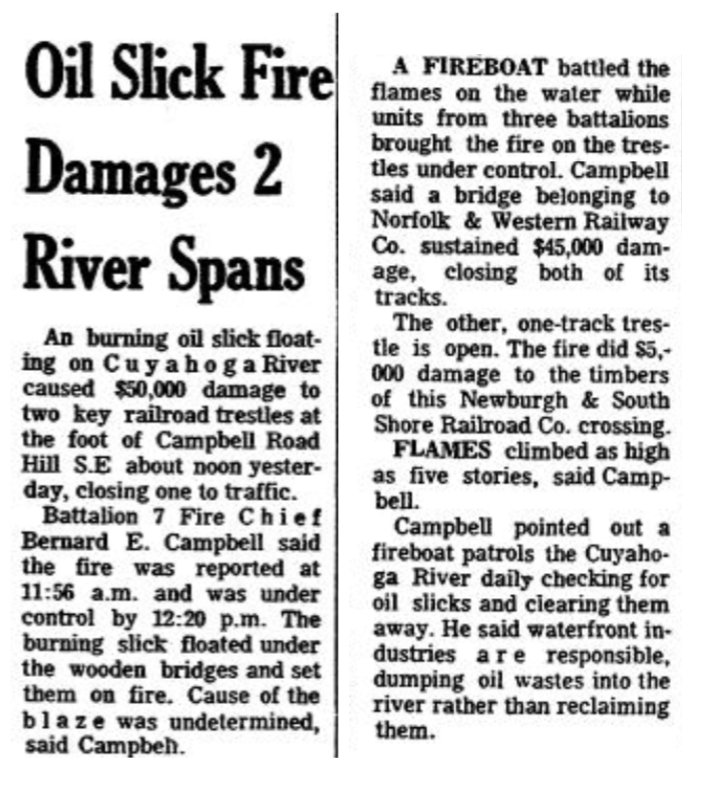The June 22, 1969 fire on the Cuyahoga River — likely caused by sparks from a passing train igniting an oil slick and industrial debris in the water — was extinguished by the Cleveland Fire Department within 20 minutes.
