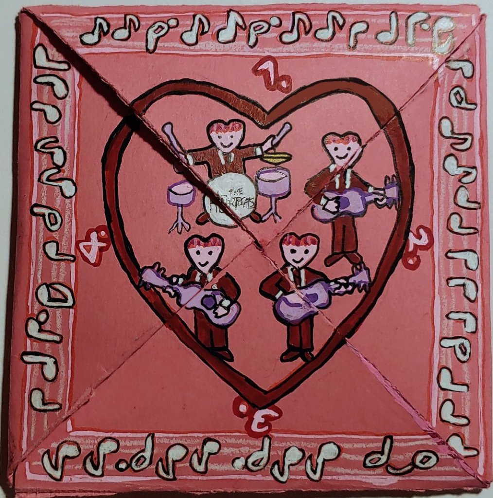 It seemed logical to use a song from Meet the Beatles as the poem for the Valentine. The one which seemed most appropos was the Beatles’ cover of “Till There Was You” from the musical The Music Man. As a bonus, the lyrics were perfectly suited for the puzzle purse structure, and offered lots of visual inspiration besides.