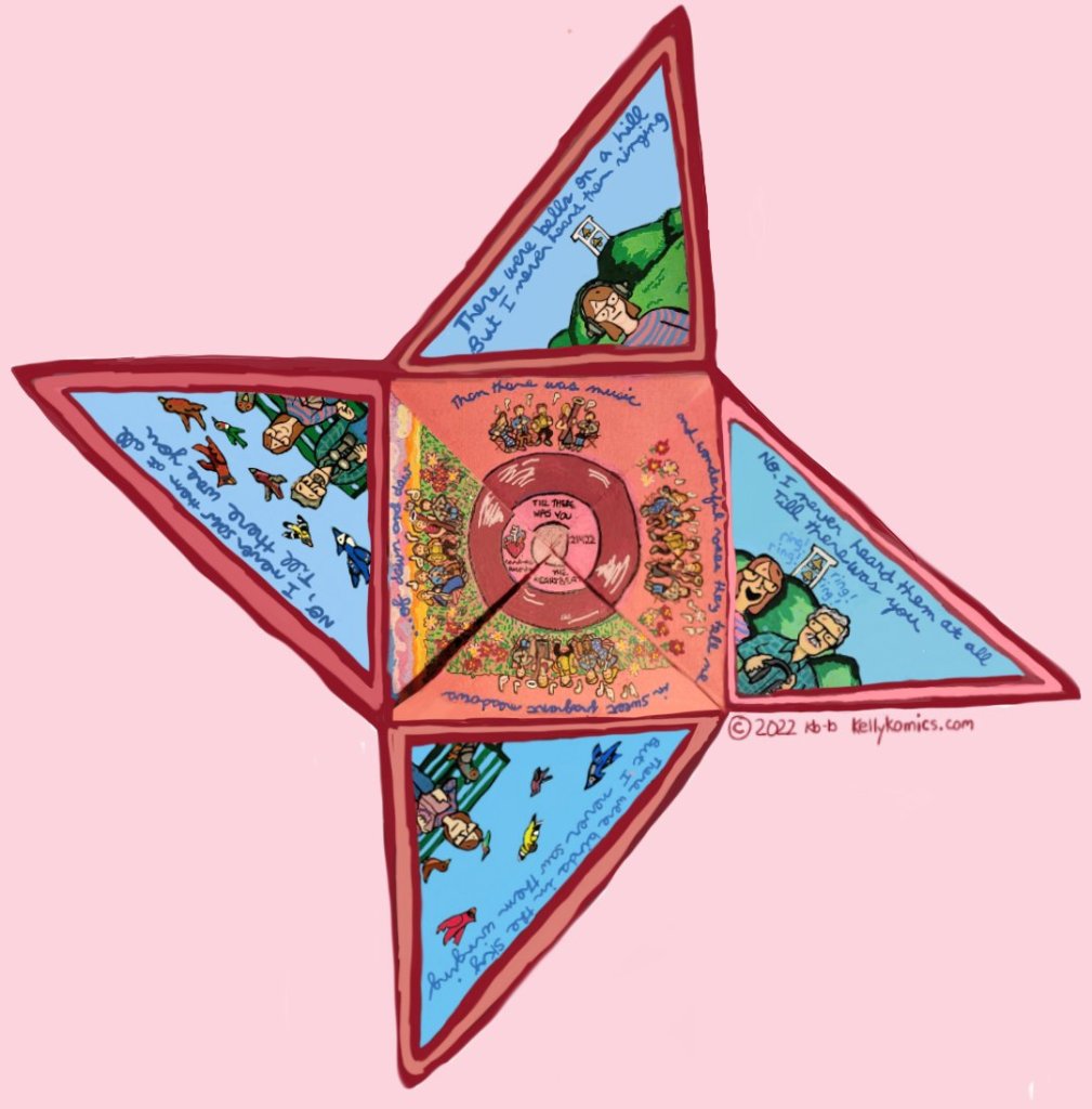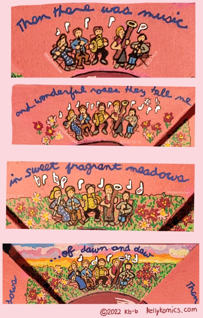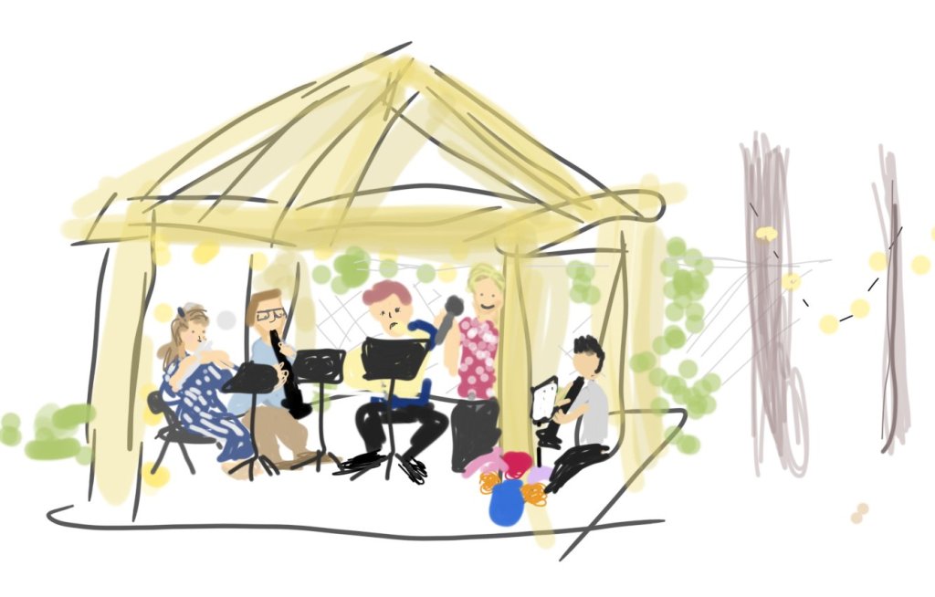 Last summer, Benjamin Franklin Community Garden — where Mr. B and I have maintained a plot for a couple of years now — invited the North Coast Winds Quintet to perform as part of its outdoor concert series, which inaugurated the garden’s brand new pavilion. I was volunteering at the merch table that night, and roughly sketched the musicians on my phone, having no idea the drawing would come in handy several months later.